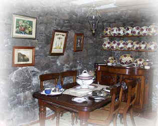 Wohnzimmer alle Wände in Naturstein und dazu hiesiges, handgemaltes