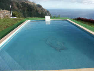 Dieser schöne Pool ist mit seinen Ausblicken auf den Atlantik und die Hochebene Paul da Serra in jeder Hinsicht einladend. Sonnenliegen stehen bereit. Unterhalb befinden sich zwei Terrassen mit Rosen- und Obstbäumen, außerdem ein kleiner Kräutergarten. Sie können das Haus auch komplett mieten, bis max. 6 Personen. |